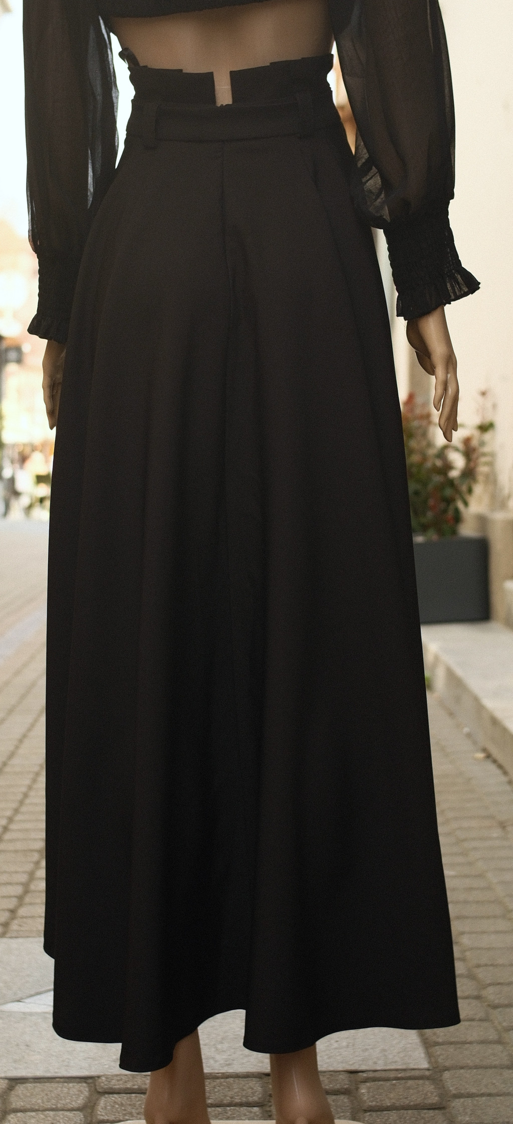 Fekete színű, barbie creppe anyagból készült, magasított derekú, aszimmetrikus szabású szoknya. Derék részét kisebb fodor dísz díszíti, saját anyagából készült keskeny megkötős övvel minimálisan szabályozható, hátul rejtett cipzárral záródik.