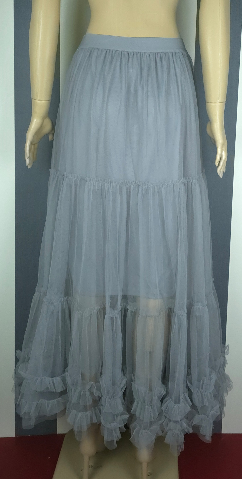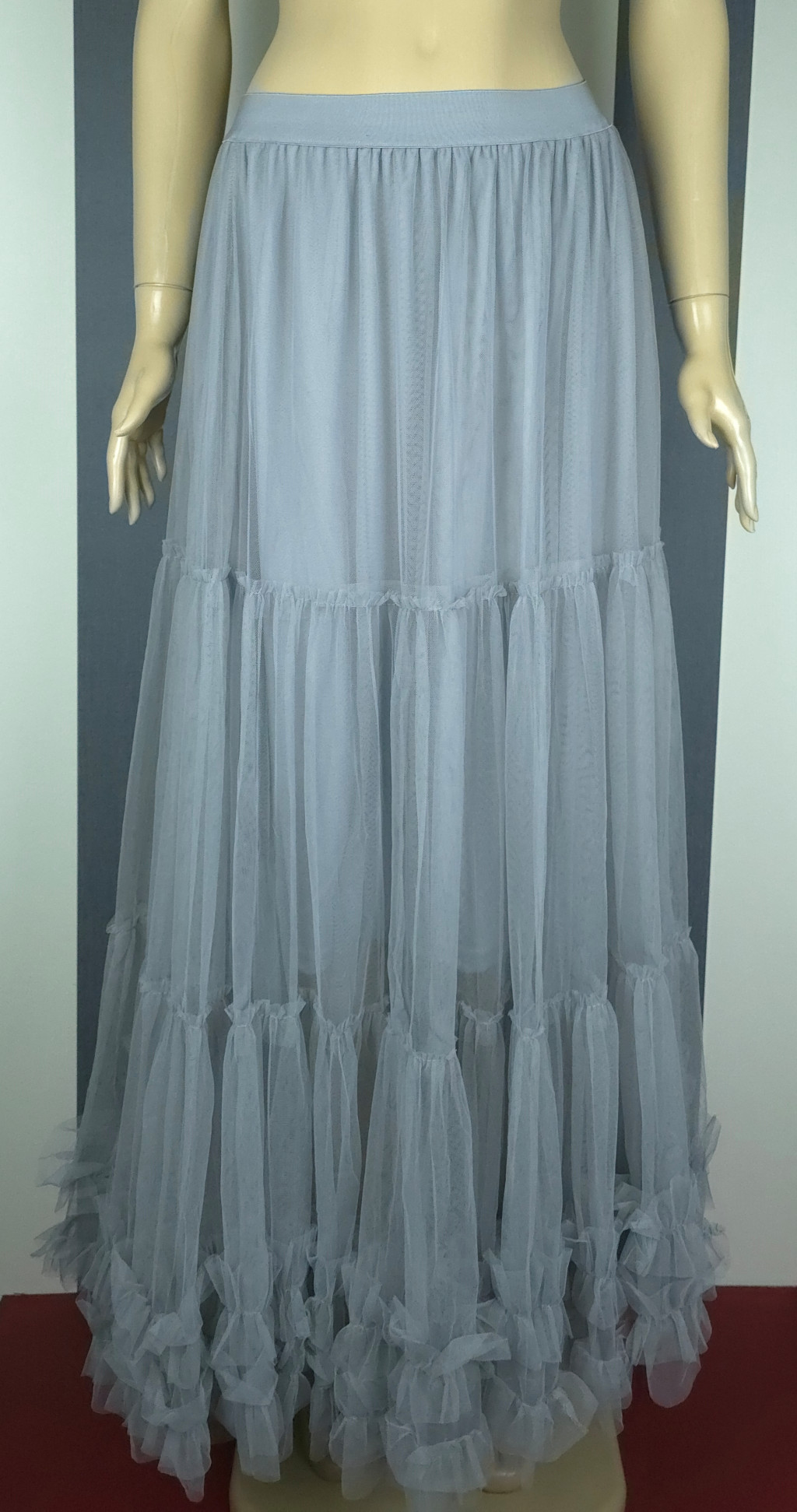 Derékban gumírozott, fodorral díszített, hosszú, 3 rétegű, szürke színű tüll szoknya