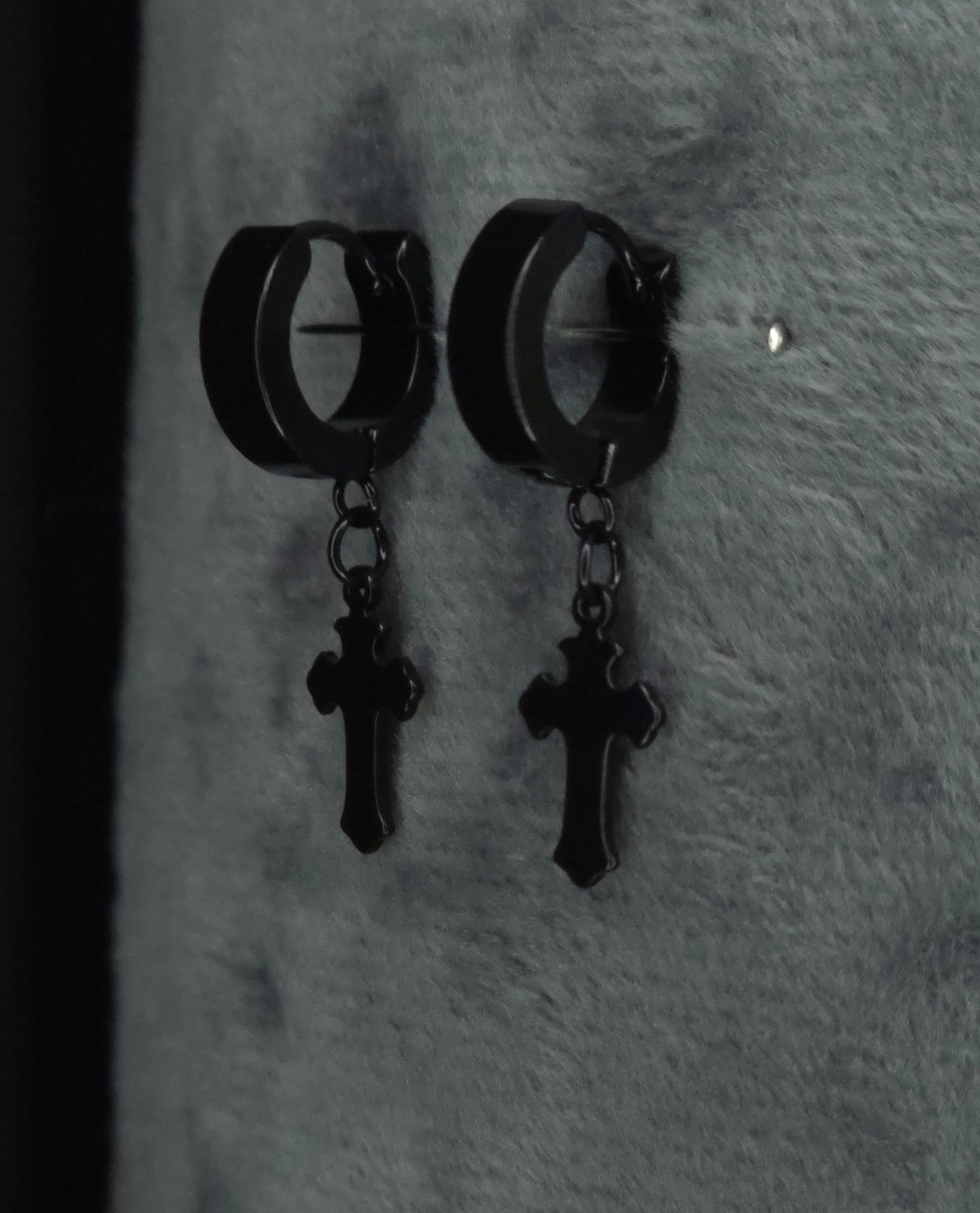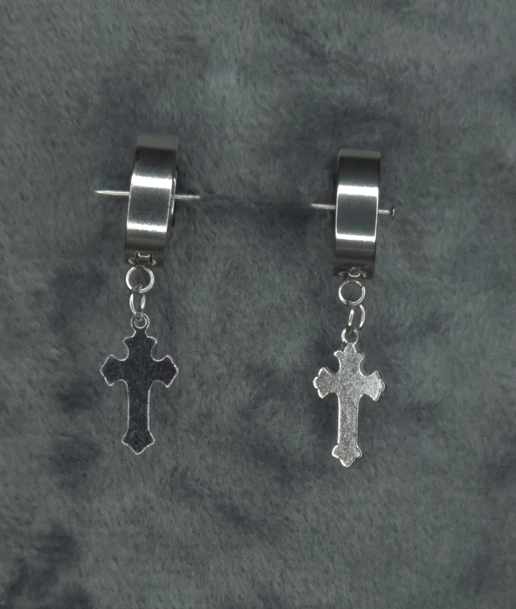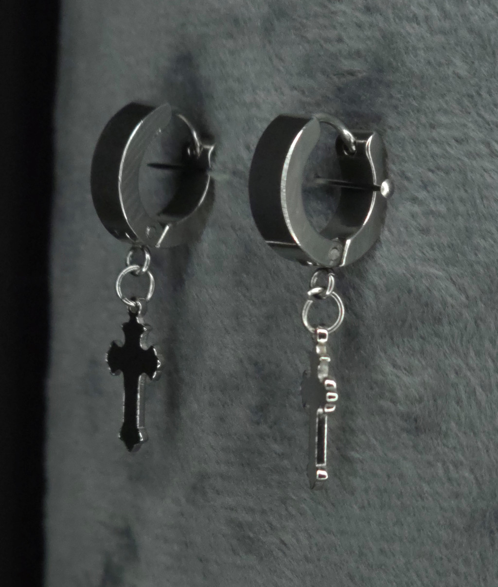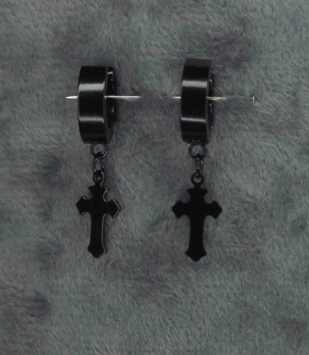 Kis karika fülbevaló liliomvégű kereszttel (fekete, ezüst)