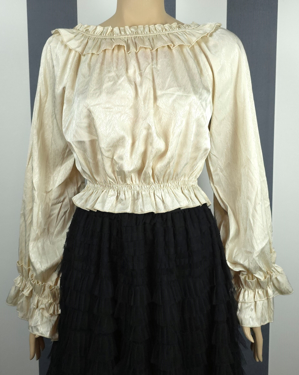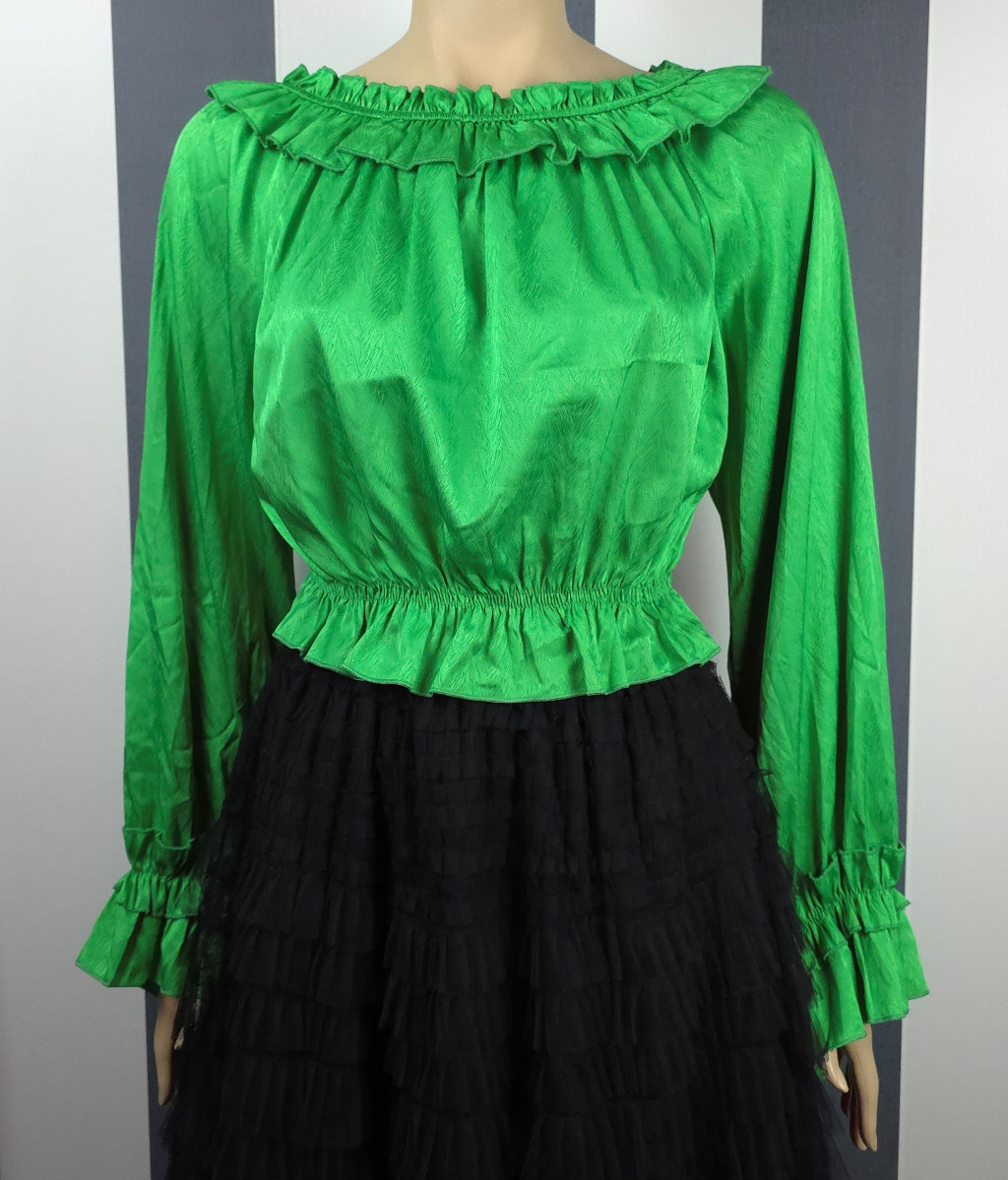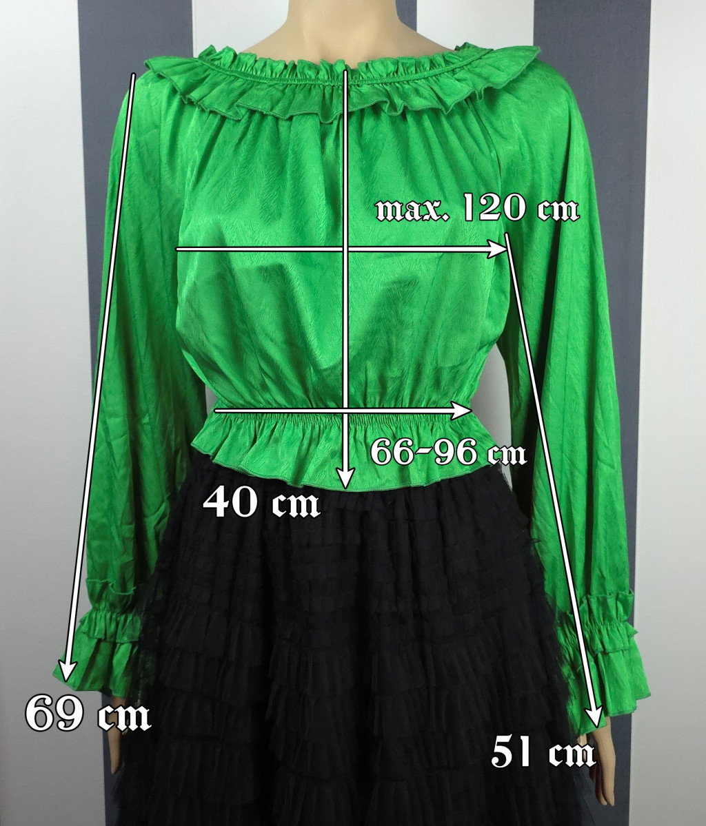 Derékban gumírozott, nyakán rávarrt gumírozott fodorral díszített, hosszú ujjú felső. Anyaga önmagában apró halszálka mintás egyszínű selyem. Kézfejnél lévő fodor gumírozott, de nem szorítja rá a kézfejre a felsőt, ezért kézfejre lazán rálóg.