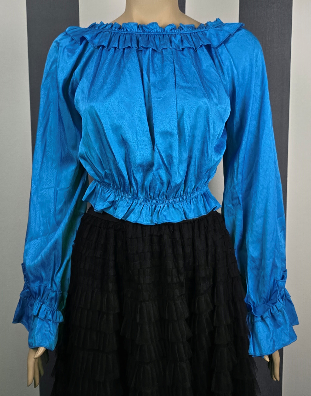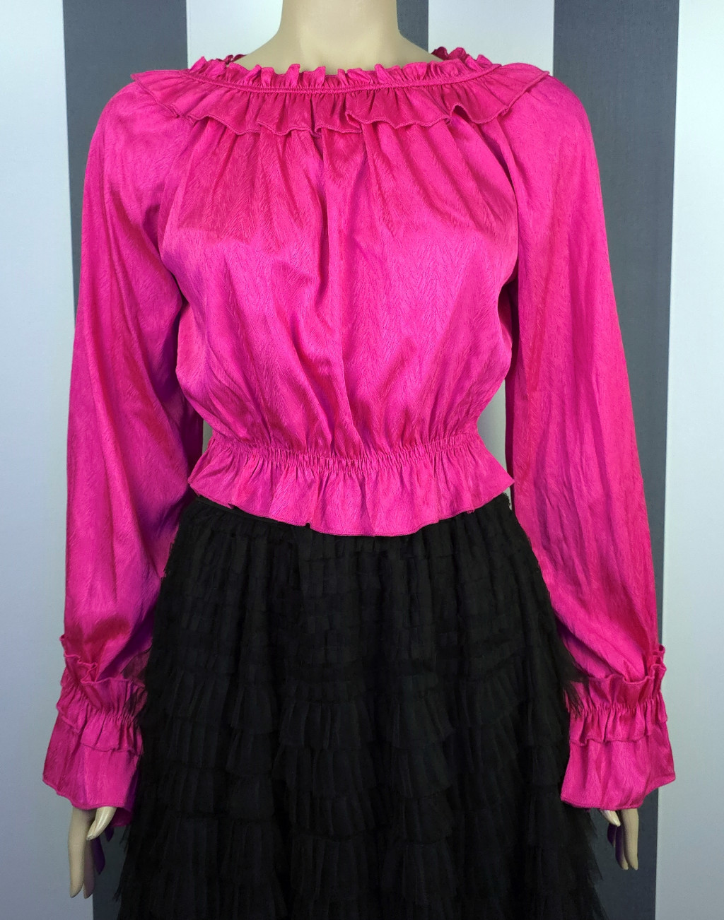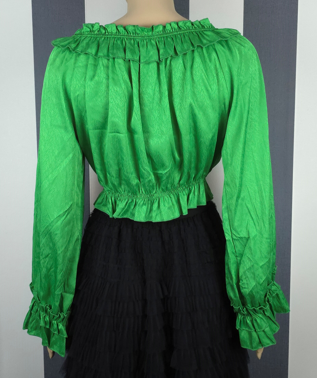 Derékban gumírozott, nyakán rávarrt gumírozott fodorral díszített, hosszú ujjú felső. Anyaga önmagában apró halszálka mintás egyszínű selyem. Kézfejnél lévő fodor gumírozott, de nem szorítja rá a kézfejre a felsőt, ezért kézfejre lazán rálóg.